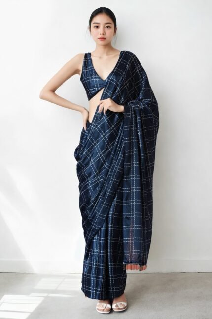 Navy Blue Chinon Digital Print Pre Draped Saree After Six Wear