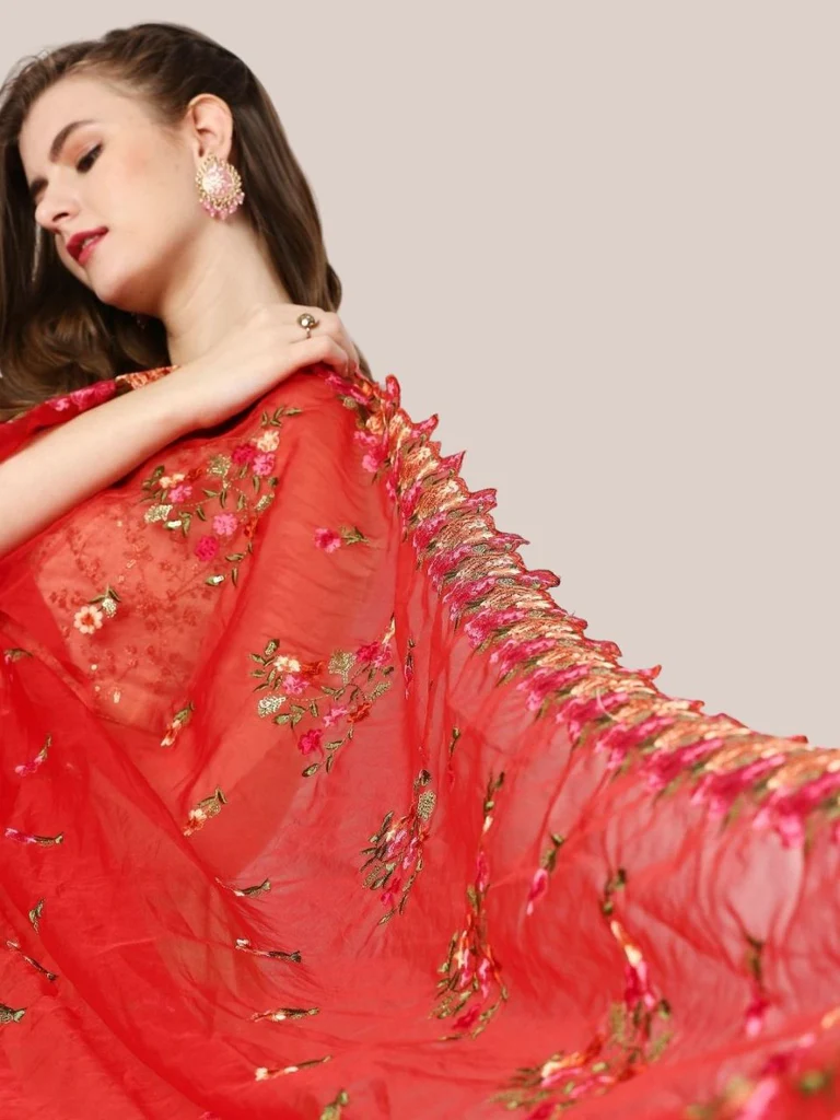 Let this season see you welcome the beauty of this organza dupatta to your ethnic fashion mix, showcasing eye some elegance and gorgeous grace! This alluring creation is adorned with beautiful multicolour floral embroidery all over. It will definitely give your feminine charm a hint of subdued elegance.