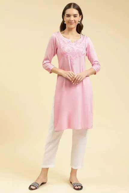 Look ethereal in this Aari work Kurti, crafted with Slik Thread.